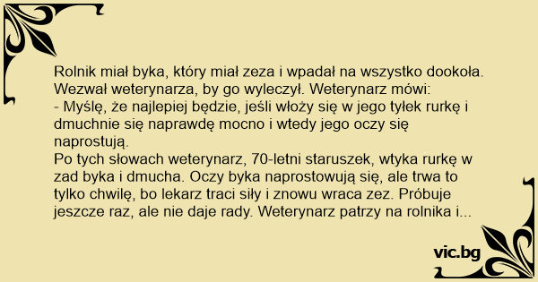 Po tych słowach weterynarz, 70-letni staruszek, wtyka rurkę w zad byka i dmucha. Oczy byka naprostowują się, ale trwa to tylko chwilę, bo lekarz traci siły i znowu wraca zez. Próbuje jeszcze raz, ale nie daje rady. Weterynarz patrzy na rolnika i mówi: