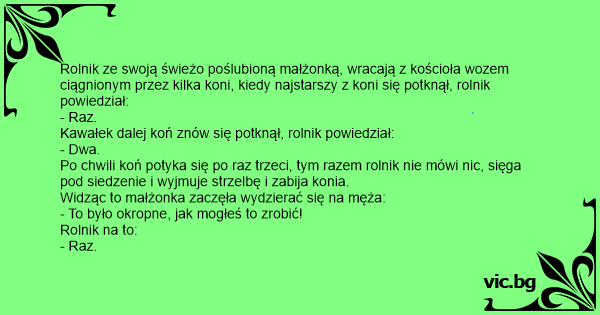 Rolnik ze swoją świeżo poślubioną małżonką, wracają z kościoła wozem ciągnionym przez kilka koni, kiedy najstarszy z koni się potknął, rolnik powiedział: