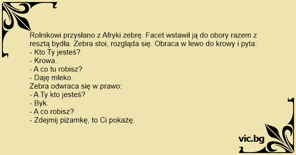 Rolnikowi przysłano z Afryki zebrę. Facet wstawił ją do obory razem z resztą bydła. Zebra stoi, rozgląda się. Obraca w lewo do krowy i pyta: