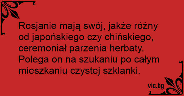 Rosjanie mają swój, jakże różny od japońskiego czy chińskiego, ceremoniał parzenia herbaty. Polega on na szukaniu po całym mieszkaniu czystej szklanki.