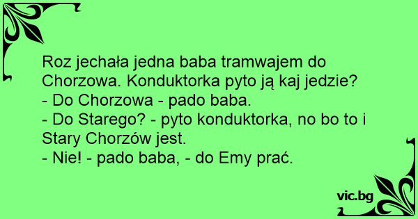 Roz jechała jedna baba tramwajem do Chorzowa. Konduktorka pyto ją kaj jedzie?
