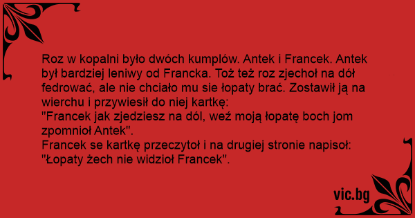 Roz w kopalni było dwóch kumplów. Antek i Francek. Antek był bardziej leniwy od Francka. Toż też roz zjechoł na dół fedrować, ale nie chciało mu sie łopaty brać. Zostawił ją na wierchu i przywiesił do niej kartkę:
