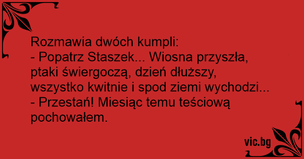 - Popatrz Staszek... Wiosna przyszła, ptaki świergoczą, dzień dłuższy, wszystko kwitnie i spod ziemi wychodzi...