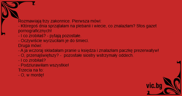 Siostra zakonna zwołała zebranie sióstr z jej zakonu. I mówi: - wczoraj w naszym zakonie był mężczyzna! Zakonnice na to: - uuuuuuuuuuuuu... A tylko jedna - hihihi!!! Siostra mówi znów: - znalazłam...