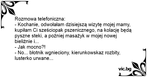 - Kochanie, odwołałam dzisiejszą wizytę mojej mamy, kupiłam Ci sześciopak pszenicznego, na kolację będą pyszne steki, a poźniej masażyk w mojej nowej bieliźnie i...