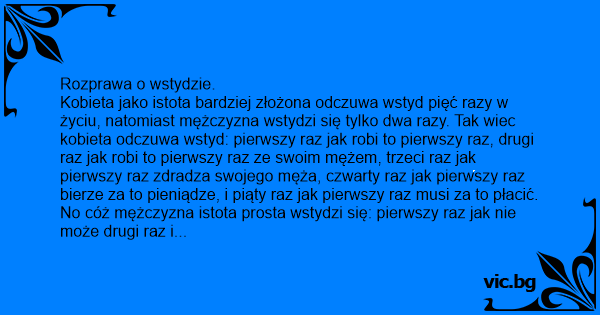 Kobieta jako istota bardziej złożona odczuwa wstyd pięć razy w życiu, natomiast mężczyzna wstydzi się tylko dwa razy. Tak wiec kobieta odczuwa wstyd: pierwszy raz jak robi to pierwszy raz, drugi raz jak robi to pierwszy raz ze swoim mężem, trzeci raz jak pierwszy raz zdradza swojego męża, czwarty raz jak pierwszy raz bierze za to pieniądze, i piąty raz jak pierwszy raz musi za to płacić.