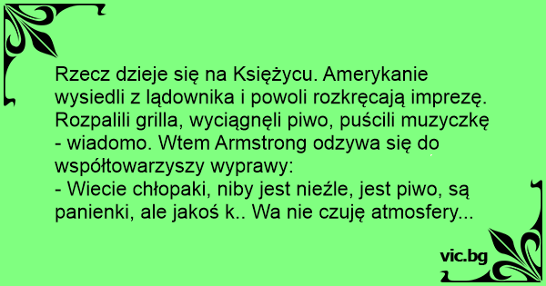 Trwa ostra imprezka na Księżycu. W pewnej chwili ktoś mówi: - Wiesz co, Armstrong. Niby wszystko się zgadza... Rozpaliliśmy grilla, jest wódeczka, są kobitki, a jakoś atmosfery nie ma.