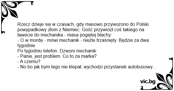 Rzecz dzieje się w czasach, gdy masowo przywożono do Polski powypadkowy złom z Niemiec. Gość przywiózł coś takiego na lawecie do mechanika - masa pogiętej blachy: