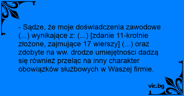 - Sądze, że moje doświadczenia zawodowe (...) wynikające z: (...) [zdanie 11-krotnie złożone, zajmujące 17 wierszy] (...) oraz zdobyte na ww. drodze umiejętności dadzą się również przeląc na inny charakter obowiązków służbowych w Waszej firmie.