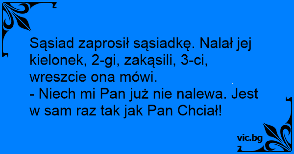 Sąsiad zaprosił sąsiadkę. Nalał jej kielonek, 2-gi, zakąsili, 3-ci, wreszcie ona mówi.