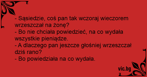 - Sąsiedzie, coś pan tak wczoraj wieczorem wrzeszczał na żonę?