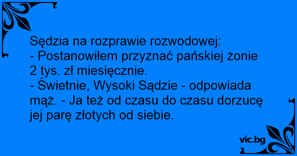 - Świetnie, Wysoki Sądzie - odpowiada mąż. - Ja też od czasu do czasu dorzucę jej parę złotych od siebie.