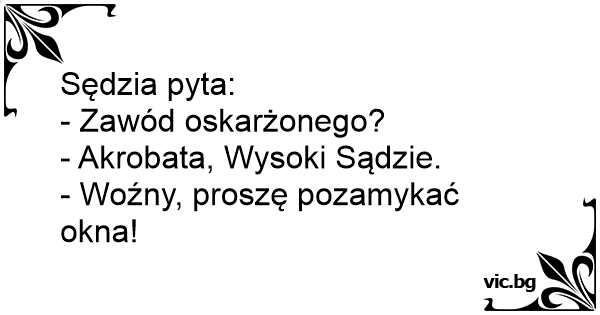 Related Deaths Στον παράδεισο Двама умрели се срещнали в рая и единият попитал: Στον παράδεισο.. Un tizio muore e va in Paradiso. Aux portes du paradis, un nouvel arrivant commence son récit: Drei Männer stehen bei Petrus an der Himmelspforte. Der fragt sie, woran sie gestorben seien. Der Erste schildert: Duas mortas conversam: — Morri congelada. — Ai que horror! — Deve ter sido horrível! — Como é morrer congelada? — Bom, no começo é muito ruim: primeiro são os arrepios, depois as dores nos dedos das mãos e dos pés, tudo congelando... Mas, depois veio um sono muito forte e eu perdi a consciência.... Estaban dos hombres en el cielo y uno le pregunta al otro: - ¿Y vos de qué moriste? - Congelado, ¿Y tú? - De la risa. - ¿Cómo que de la risa? - Sí, es que yo pensaba que mi esposa me estaba... W drodze do nieba spotykają się dusze dwóch facetów i zaczynają rozmowę: - Ja zmarłem przez zimno. No wiesz niska temperatura, organizm nie wytrzymał. - Ja zmarłem ze zdziwienia. - Jak to ze... Съдията: - Професия? - Акробат господине - Разсилни, затворете прозорците Twee domme blondjes komen elkaar tegen in de hemel. Hoe ben jij gestorven? vraagt de ene Ik ben doodgevroren. Amai, dat is verschrikkelijk. Hoe voelt dat aan, doodvriezen? Eerst heb je geen gevoel... Sędzia pyta oskarżonego: - Pański zawód? - Akrobata. Sędzia szepcze coś do siedzącego obok drugiego sędziego i po chwili woła: - Woźny! Proszę pozamykać wszystkie okna! Død af kulde To mænd mødes i himlen, og den ene siger: - Jeg døde af kulde, hvad døde du af? - Lettelse. - Hvordan det? - Jo, jeg havde mistanke om at min kone havde en elsker så jeg tog tidligt... Noris tiesas process. Tiesnesis apsūdzētajam jautā: - Kāda ir jūsu profesija? - Akrobāts. - Apsardze,lūdzu,aizveriet logu!