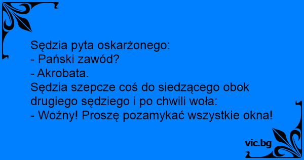 Sędzia pyta: - Zawód oskarżonego? - Akrobata, Wysoki Sądzie. - Woźny, proszę pozamykać okna!