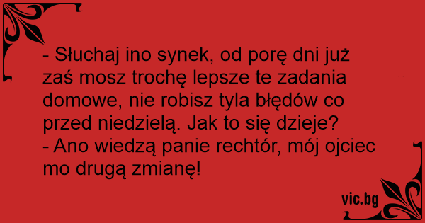 - Słuchaj ino synek, od porę dni już zaś mosz trochę lepsze te zadania domowe, nie robisz tyla błędów co przed niedzielą. Jak to się dzieje?