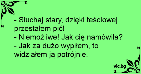 - Słuchaj stary, dzięki teściowej przestałem pić!