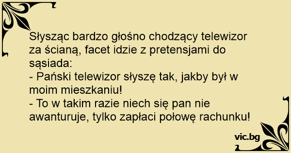 Słysząc bardzo głośno chodzący telewizor za ścianą, facet idzie z pretensjami do sąsiada: