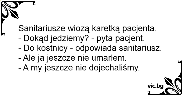 Greitosios pagalbos mašinoje pacijentas klausia: - Kur mane vežat? - Į morgą. - Bet aš dar nenumiriau? - O, mes dar neatvažiavom.