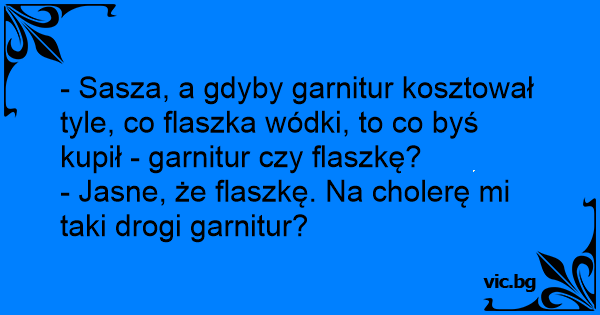 - Sasza, a gdyby garnitur kosztował tyle, co flaszka wódki, to co byś kupił - garnitur czy flaszkę?
