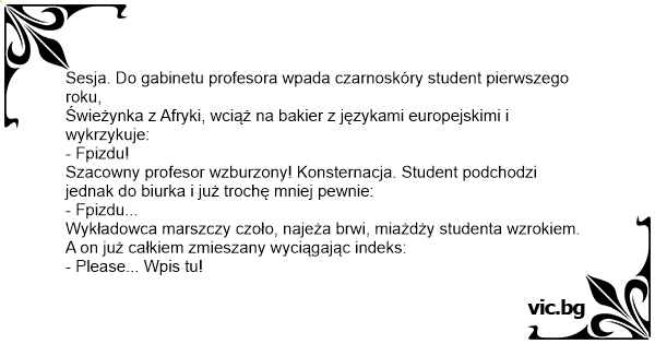 Sesja. Do gabinetu profesora wpada czarnoskóry student pierwszego roku,