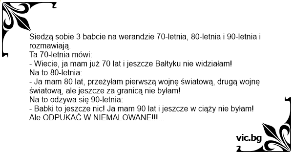 - Babki to jeszcze nic! Ja mam 90 lat i jeszcze w ciąży nie byłam! Ale ODPUKAĆ W NIEMALOWANE!!!...