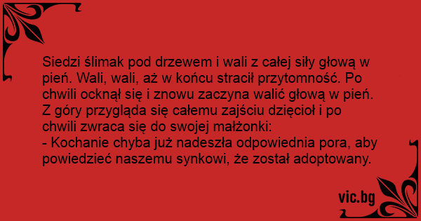 Siedzi ślimak pod drzewem i wali z całej siły głową w pień. Wali, wali, aż w końcu stracił przytomność. Po chwili ocknął się i znowu zaczyna walić głową w pień. Z góry przygląda się całemu zajściu dzięcioł i po chwili zwraca się do swojej małżonki: