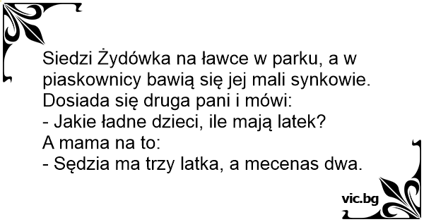 Siedzi Żydówka na ławce w parku, a w piaskownicy bawią się jej mali synkowie. Dosiada się druga pani i mówi: