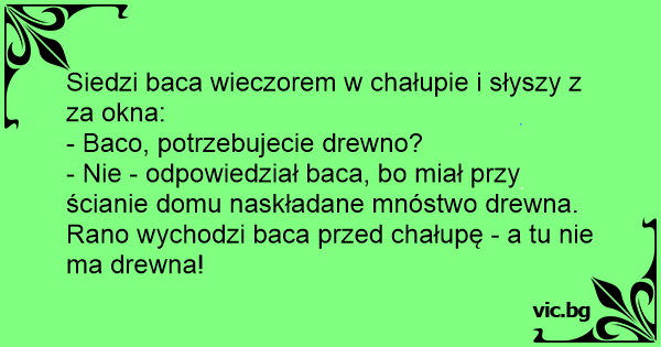 - Nie - odpowiedział baca, bo miał przy ścianie domu naskładane mnóstwo drewna. Rano wychodzi baca przed chałupę - a tu nie ma drewna!