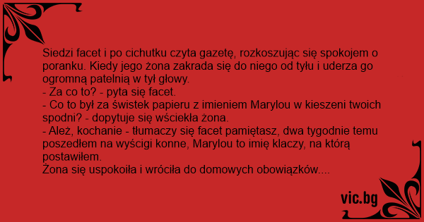Siedzi facet i po cichutku czyta gazetę, rozkoszując się spokojem o poranku. Kiedy jego żona zakrada się do niego od tyłu i uderza go ogromną patelnią w tył głowy.