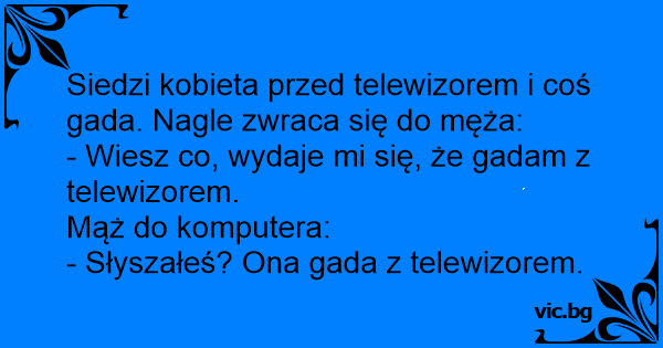 Siedzi kobieta przed telewizorem i coś gada. Nagle zwraca się do męża: