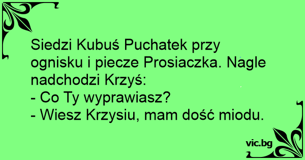 Siedzi Kubuś Puchatek przy ognisku i piecze Prosiaczka. Nagle nadchodzi Krzyś: