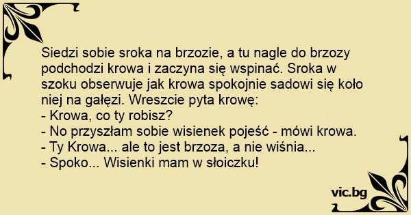 Siedzi sobie sroka na brzozie, a tu nagle do brzozy podchodzi krowa i zaczyna się wspinać. Sroka w szoku obserwuje jak krowa spokojnie sadowi się koło niej na gałęzi. Wreszcie pyta krowę: