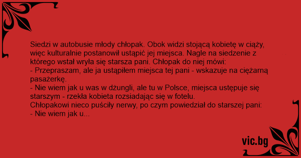 Siedzi w autobusie młody chłopak. Obok widzi stojącą kobietę w ciąży, więc kulturalnie postanowił ustąpić jej miejsca. Nagle na siedzenie z którego wstał wryła się starsza pani. Chłopak do niej mówi: