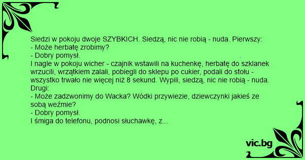 I nagle w pokoju wicher - czajnik wstawili na kuchenkę, herbatę do szklanek wrzucili, wrzątkiem zalali, pobiegli do sklepu po cukier, podali do stołu - wszystko trwało nie więcej niż 8 sekund. Wypili, siedzą, nic nie robią - nuda. Drugi: