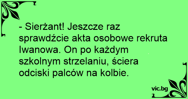 - Sierżant! Jeszcze raz sprawdźcie akta osobowe rekruta Iwanowa. On po każdym szkolnym strzelaniu, ściera odciski palców na kolbie.