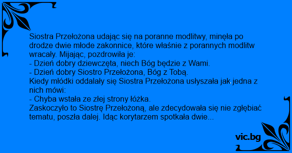 Zaskoczyło to Siostrę Przełożoną, ale zdecydowała się nie zgłębiać tematu, poszła dalej. Idąc korytarzem spotkała dwie Siostry, które nauczały już w klasztorze od kilku lat. Po wymianie powitań (Dzień dobry, Bóg z Tobą/Wami...) Siostra Przełożona znowu odchodząc usłyszała jak jedna mówi do drugiej: