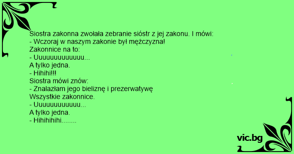 Matka představená si svolá sestry: „Sestry, stala se vážná věc, v klášteře byl nalezen prezervativ.” „Oooh!” ozve se mezi sestrami, jen jeden hlas: „Chi chi chi!” „Sestry,” pokračuje matka...