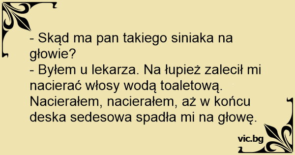 - Byłem u lekarza. Na łupież zalecił mi nacierać włosy wodą toaletową. Nacierałem, nacierałem, aż w końcu deska sedesowa spadła mi na głowę.