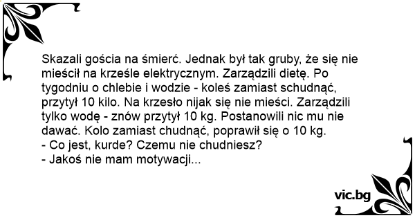 Skazali gościa na śmierć. Jednak był tak gruby, że się nie mieścił na krześle elektrycznym. Zarządzili dietę. Po tygodniu o chlebie i wodzie - koleś zamiast schudnąć, przytył 10 kilo. Na krzesło nijak się nie mieści. Zarządzili tylko wodę - znów przytył 10 kg. Postanowili nic mu nie dawać. Kolo zamiast chudnąć, poprawił się o 10 kg.