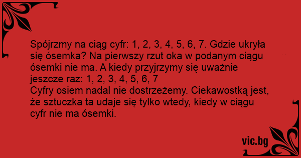 Spójrzmy na ciąg cyfr: 1, 2, 3, 4, 5, 6, 7. Gdzie ukryła się ósemka? Na pierwszy rzut oka w podanym ciągu ósemki nie ma. A kiedy przyjrzymy się uważnie jeszcze raz: 1, 2, 3, 4, 5, 6, 7