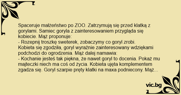Affen aufmuntern Στο ζωολογικό κήπο Γορίλας идут, значит, паpень(п) с девушкой(д) по зоопаpку, гуляют себе.... привел парень свою блондинку в зоопарк. подошли к клетке с... Мъж и жена пред клетката на горилата. Горилата седи на клона и зяпа жената. Мъжът я сръгва: Ένας τύπος πάει με την γυναίκα του στον ζωολογικό κήπο. Κάποια στιγμή φτάνουν μπροστά σε ένα κλουβί με έναν τεράστιο άγριο γορίλα. Μια ταμπέλα μπροστά στο κλουβί έγραφε: Un jour un homme emmène sa femme au zoo et alors qu'il passe devant la cage d'un énorme gorille il demande à sa femme: - Vas-y montre-lui ta cuisse. la femme un peu hésitante et pudique demande pourquoi son mari lui demande ça mais finit par accepter. puis le mari lui dis: - Vas-y maintenant... Geht ein Pärchen im Zoo spazieren. Vor dem Käfig eines mächtigen Gorillas bleiben sie stehen. Der Gorilla sieht die Frau und scheint sie geil zu finden. Der Mann ist begeistert und sagt zu seiner... Ein junges Ehepaar geht in den Zoo. Vor dem Gorillagehege bemerken die beiden, dass sich das Gorillamännchen ganz besonders für den Ausschnitt der jungen Dame interessiert. Die findet das sehr... Een echtpaar was een dagje uit naar de dierentuin. Toen ze bij het apenhuis bij de grote gorilla kwamen, zei de man tegen zijn vrouw,"Open je blouse een beetje". Toen ze dat deed, kwam de gorilla... Małżeństwo wybrało się do ZOO. Przed klatką z gorylem żona mówi: - Popatrz tylko: tak właśnie powinien wyglądać prawdziwy mężczyzna! Te bicepsy, taki dziki wzrok, ta postura... Nagle goryl wysuwa... En man och hans fru var på zoo. När de gick fram till gorillan, så blev den alldeles till sig när den fick syn på frun. Eftersom de var ensamma, så sa mannen till frun att visa brösten för... Ion si Maria merg la zoo si se opresc in fata custii unei gorile. Ion zice Mariei: - Tu Marie, ia desfa-ti un nasture de la bluza! - Ma Ioane, tu esti nebun ? - Taci tu, desfa numa un nasture!... Manžel s manželkou jdou do zoo a zastaví se u klece s orangutanem. Žena má perfektní postavu, zkrátka kost. Muž jí povídá: „Sundej si podprsenku, schválně co to s ním udělá.” Žena poslechne a sundá... Et par stod foran hangorillaens bur. Gorillaen virkede opstemt over at se konen i nederdel, og manden tog straks udfordringen op. - Prøv at vis lidt af dit ene bryst. Konen trak lidt af skjorten... Uma mulher mais que gostosa vai ao zoológico com o marido, vestida pra matar, um vestidinho bem leve, um tanto transparente, de alcinha... Ao passar na ala dos macacos, um gorila começa a pular e... O milionário chega tarde em casa, completamente bêbado. Puxa um revólver, aponta pra mulher lindíssima e ordena: — Quero que você fique completamente nua. Depois se cubra com um roupão de banho e... On kaunis kevätpäivä ja aviopari käyskentelee eläintarhassa. Sangen muodokkaalla vaimolla on tyköistuva hihaton kesämekko. Pari kävelee apinoiden aitaukseen ja saapuu valtavan gorillan häkille.... Una pareja de esposos están en el zoológico y pasan por la jaula del gorila macho. "Marcos" -dice la mujer- "¿Sabes que los gorilas son los animales más parecidos al ser humano en cuanto a su... It’s a beautiful warm day and a man and his wife are at the Zoo. She’s wearing a cute loose-fitting, pink spring dress, sleeveless with straps. As they walk through the ape exhibit and pass in...