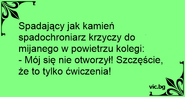 Spadający jak kamień spadochroniarz krzyczy do mijanego w powietrzu kolegi: