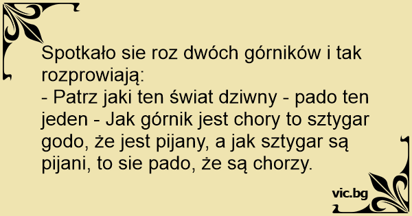 - Patrz jaki ten świat dziwny - pado ten jeden - Jak górnik jest chory to sztygar godo, że jest pijany, a jak sztygar są pijani, to sie pado, że są chorzy.