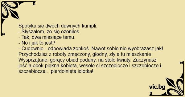 - Cudownie - odpowiada żonkoś. Nawet sobie nie wyobrażasz jak!Przychodzisz z roboty zmęczony, głodny, zły a tu mieszkanie