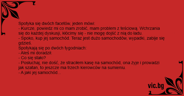 - Kurcze, powiedz mi co mam zrobić, mam problem z teściową. Wchrzania się do każdej dyskusji, kłócimy się - nie mogę dojść z nią do ładu.