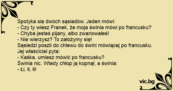 Sąsiedzi poszli do chlewu do świni mówiącej po francusku. Jej właściciel pyta: