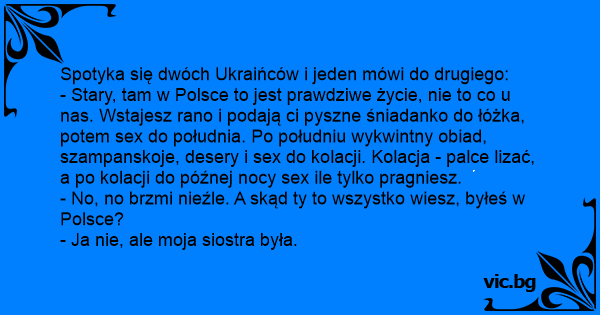 - Stary, tam w Polsce to jest prawdziwe życie, nie to co u nas. Wstajesz rano i podają ci pyszne śniadanko do łóżka, potem sеx do południa. Po południu wykwintny obiad, szampanskoje, desery i sеx do kolacji. Kolacja - palce lizać, a po kolacji do późnej nocy sеx ile tylko pragniesz.