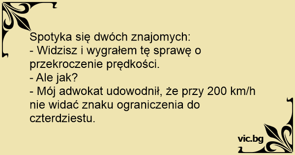 - Mój adwokat udowodnił, że przy 200 km/h nie widać znaku ograniczenia do czterdziestu.