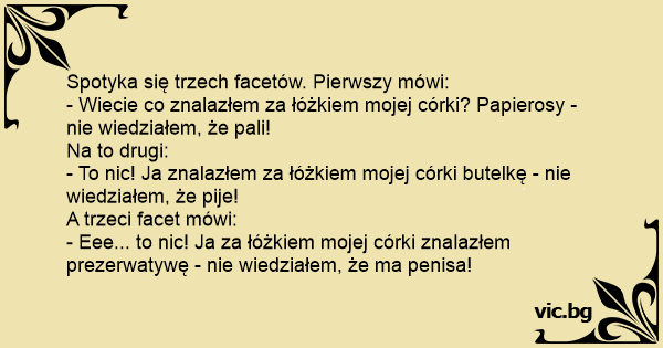 - Eee... to nic! Ja za łóżkiem mojej córki znalazłem prezerwatywę - nie wiedziałem, że ma penisa!