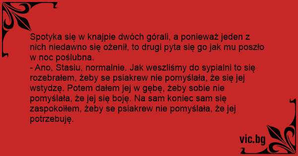Spotyka się w knajpie dwóch górali, a ponieważ jeden z nich niedawno się ożenił, to drugi pyta się go jak mu poszło w noc poślubna.